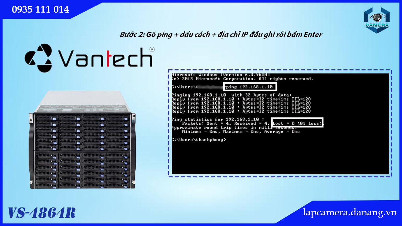 Bước 2: Gõ ping + dấu cách + địa chỉ IP đầu ghi rồi bấm Enter. Đối với đầu ghi camera Vantech sẽ có địa chỉ IP mặc định là 192.168.1.10. Trong trường hợp người dùng muốn thay đổi thông số của nó chỉ cần vào phần Network.