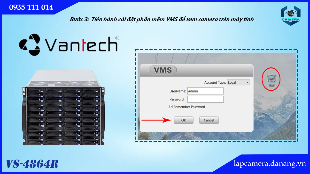 Sau khi đã tải về, khởi động file cài đặt của VMS lên, bấm chọn Next > Chọn tiếp Next > Install. Tiếp theo, biểu tượng của phần mềm VMS sẽ hiện lên trên màn hình. Lúc này, khởi động phần mềm VMS và bấm chọn OK để đăng nhập.