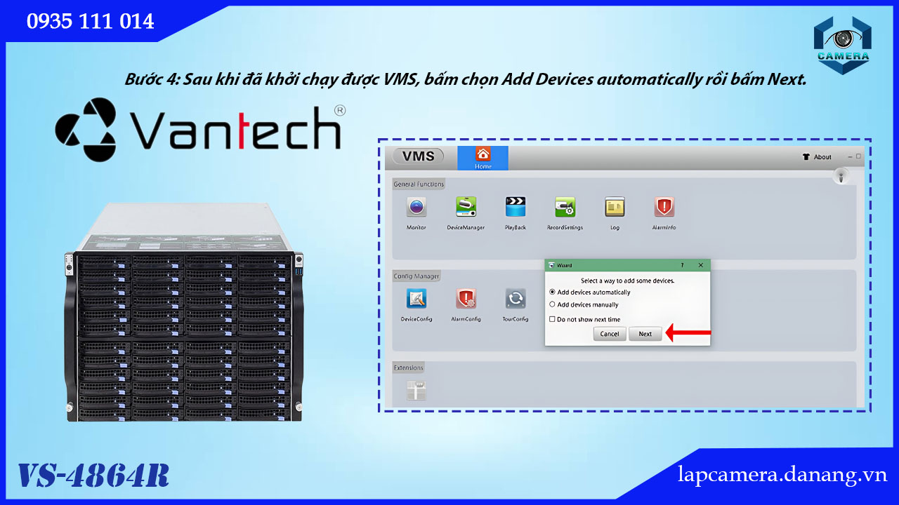 Bước 4: Sau khi đã khởi chạy được VMS, bấm chọn Add Devices automatically rồi bấm Next. Có thể tắt bảng đó đi rồi chọn Device Manager trong danh sách biểu tượng ban đầu để cài đặt xem camera trên máy tính.
