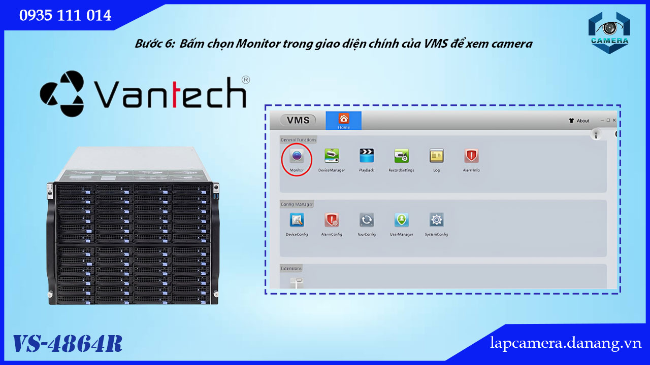 Bước 6: Bây giờ thì người dùng có thể dễ dàng xem camera wifi Vantech qua mạng, chỉ cần kết nối Internet. Không cần sử dụng tên miền nào khác. Bấm chọn Monitor trong giao diện chính của VMS để xem camera.
